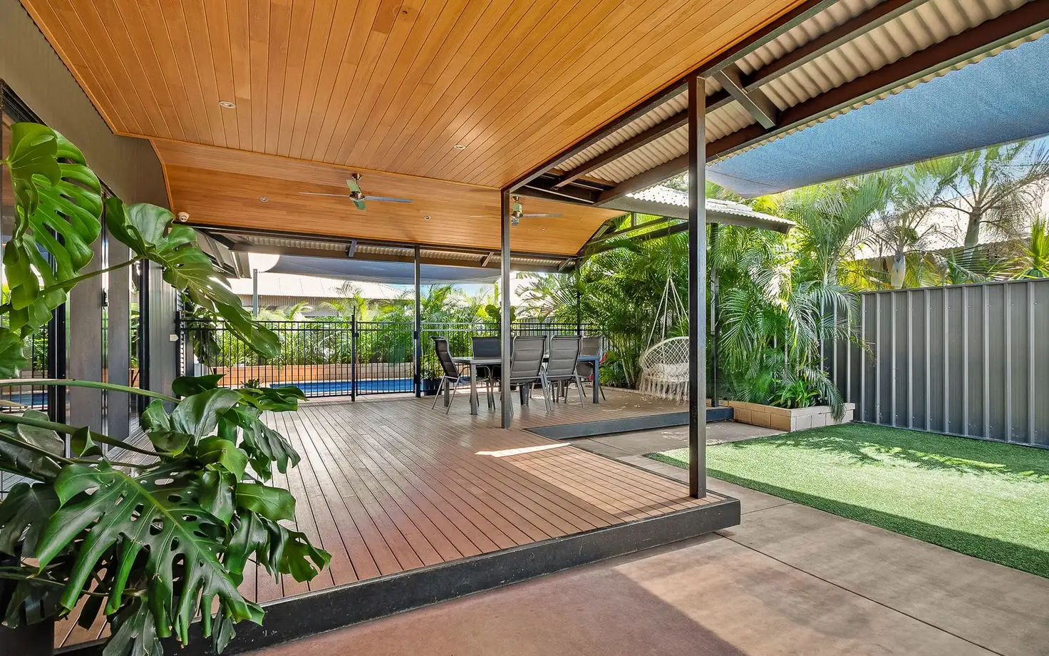 * Backyard – decked patio, timber-lined ceilings with fans