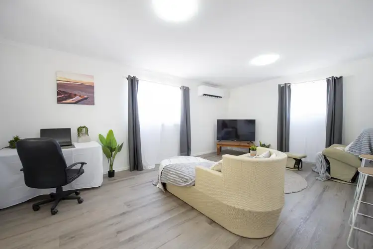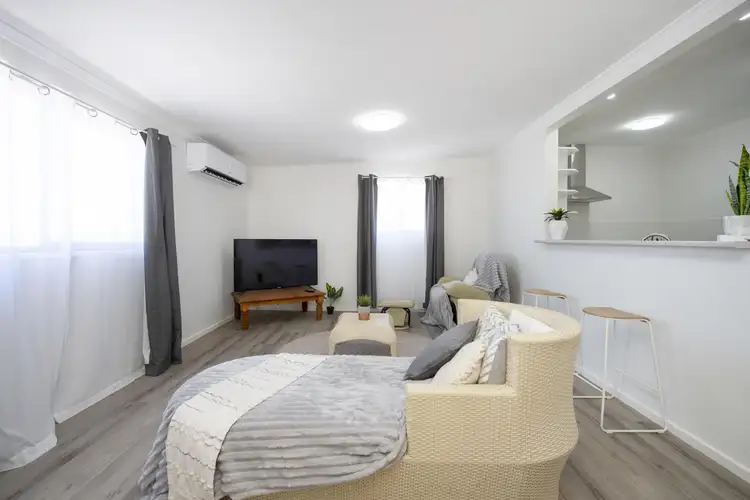 Accommodation comprises four bedrooms, including two double-sized rooms, one equipped with built-in storage and another with a split-system air conditioner. All bedrooms feature new carpeting. The bathroom and separate toilet have been fully renovated, and a 7.2 kW reverse-cycle split-system air conditioning unit ensures year-round climate control.