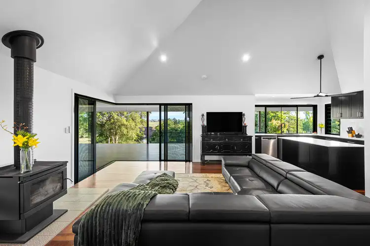 The main pavilion encompasses a sleek designer kitchen, dining and living spaces with soaring vaulted ceilings, polished timber floors, air-conditioning, and a wood fireplace, all framed by stacker doors opening to the entertainer’s deck with breathtaking views across to the Mary River.