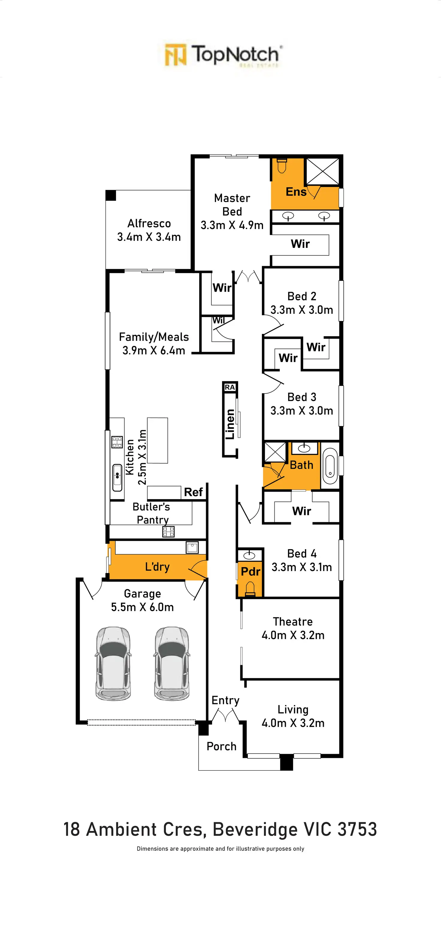 The three secondary bedrooms are well-sized all equipped with walk-in robes (Wir), ensuring space and comfort for all.