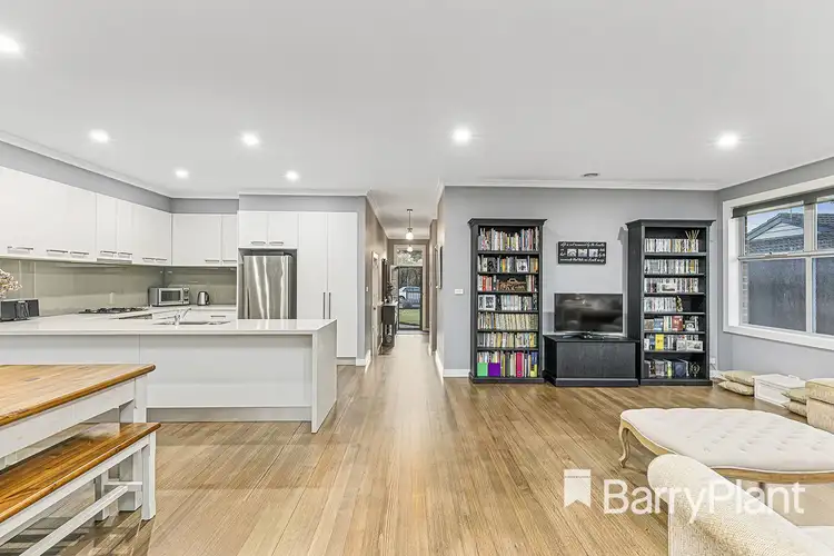 An extensive hallway culminates with a spacious open plan family, dining and kitchen precinct flooded with natural light and split-system air-conditioning for added comfort.