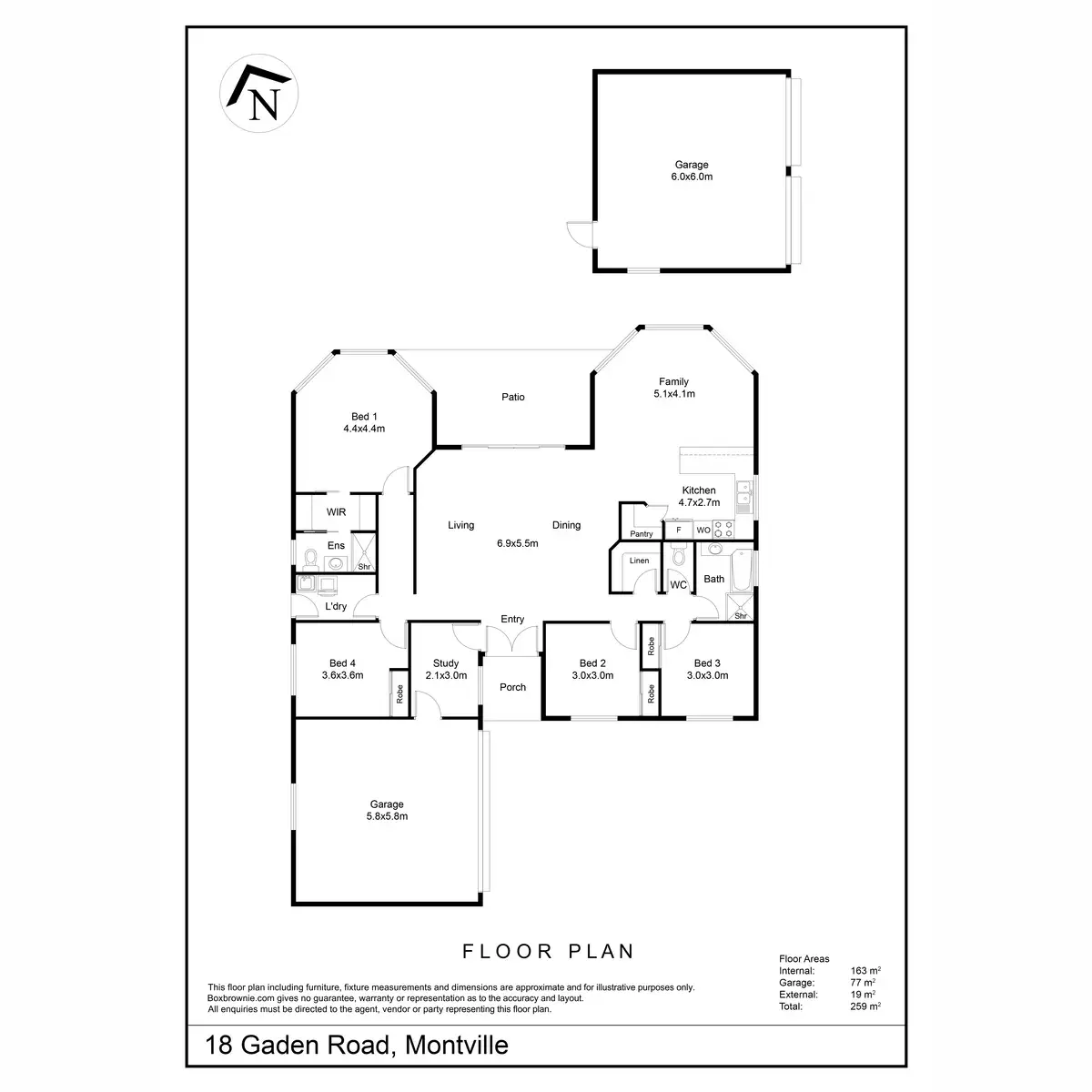 With four bedrooms, a study, two bathrooms, and two inviting living areas, this thoughtful home design caters to modern family living. The central kitchen with a breakfast bar for casual dining adjoins the dining room, adorned with a bay window overlooking the garden, and serves as the heart of the home.
