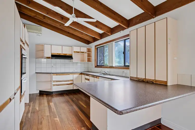 Raked cathedral ceilings with exposed timber beams, timber floors in dining/hall/kitchen, new carpets in bedrooms, air-conditioning, ceiling fans, security screens, separate shower and bath in main bathroom, electronic gated entry, and lock-up garden shed are existing features of note; and the home has been freshly painted throughout.