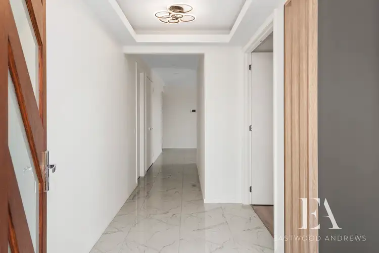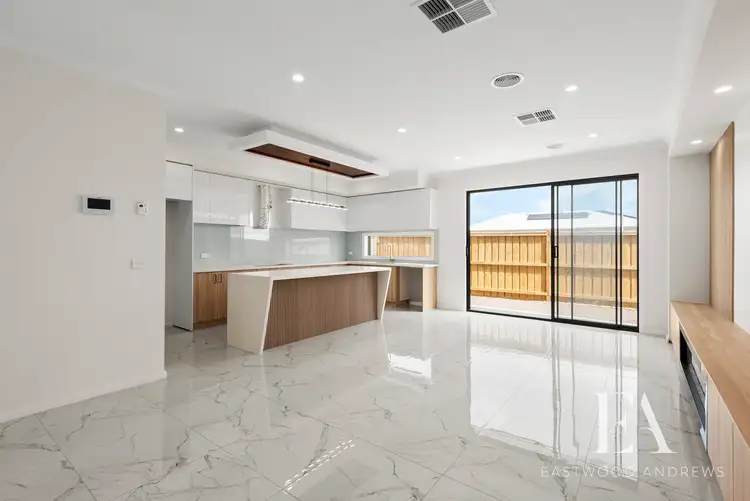 Upon entering, the high, layered ceilings, stunning marble-style tiles, and elegant chandeliers immediately set the tone for refined living. The front right of the home boasts a sunlit living area, seamlessly connected to the open-plan living, dining, and kitchen spaces that open up to the rear alfresco. The gourmet kitchen is a chef's delight, featuring stone benches, an island bench, walk-in pantry, 900mm gas cooktop/oven, and a dishwasher (to be installed prior to occupancy). Custom timber cabinetry, glass splashback, and an ornate electric fireplace integrated into a feature wall elevate the overall aesthetic. The primary living area is complemented by a secondary living space at the front, offering versatility for various lifestyle needs. The master bedroom is a retreat in itself, featuring a spacious walk-in robe and an ensuite with a stylish double vanity, a beautiful corner shower with deluxe fittings, and a separate toilet. Three additional generously sized bedrooms, one with a walk-in robe and two with built-in floor-to-ceiling mirror robes, provide ample accommodation space. The centrally located main bathroom includes a bath, shower, and separate toilet for convenience.
