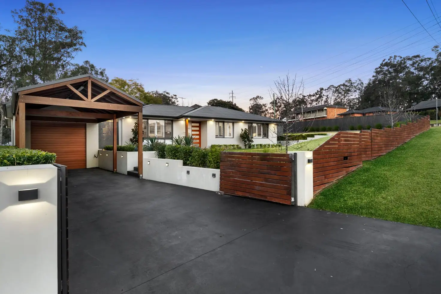 • Landscaped lawns and gardens with retaining walls and privacy hedging