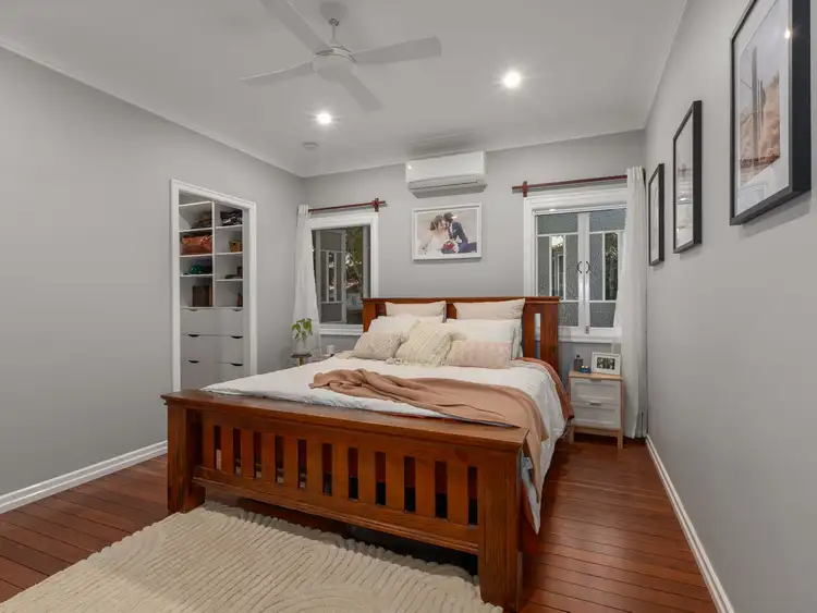 Step through the front door and be greeted by soaring ceilings, original cornicing, and polished timber flooring that flow throughout the home. The residence offers three spacious bedrooms, that you'd expect from a Queenslander and fourth bedroom option or study, two stylish bathrooms, and multiple living zones designed to suit family living. Air-conditioning and ceiling fans feature throughout, creating year-round comfort.