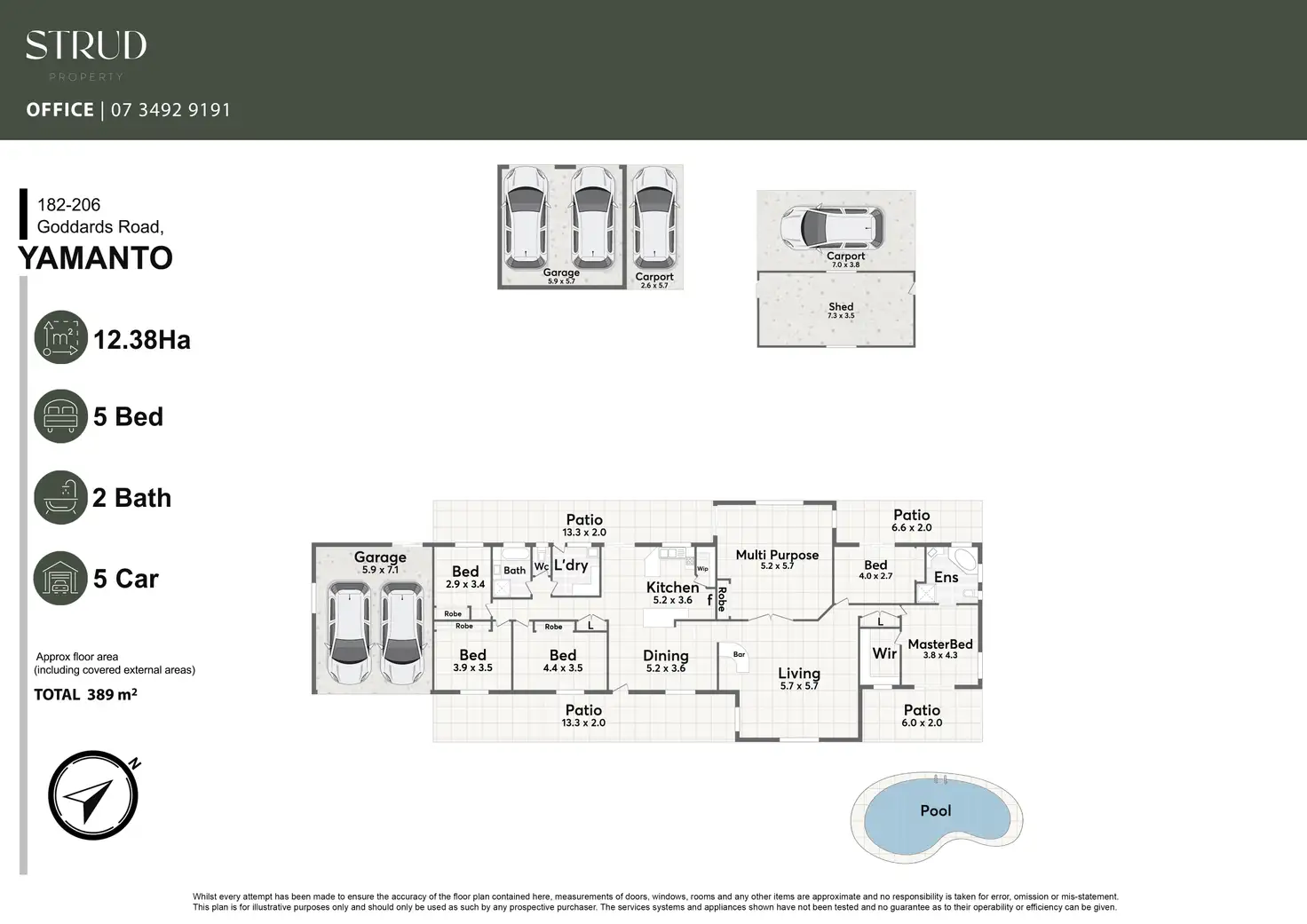 • Low set brick home with approximately 389m² under roof, including patios, garage and carports