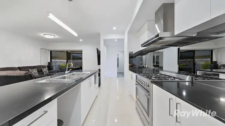The incredible kitchen is the centrepiece of this expansive home. Featuring a mirrored splashback, effectively opening up the space, as well as an island bench featuring a 40mm stone benchtop, a 900mm wide stainless steel freestanding cooker with gas cooktop and upgraded range-hood, stylish cabinetry and walk-in pantry, this kitchen will impress the chef of any family.