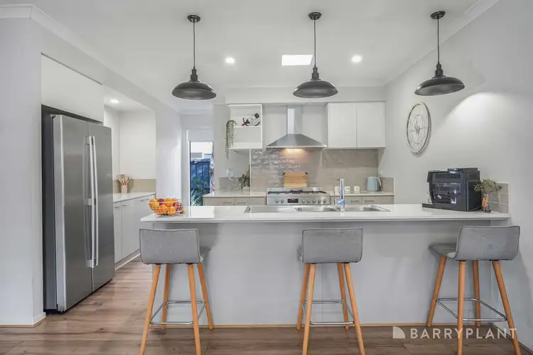 Step inside and you're greeted by a wide, welcoming hallway that immediately sets the tone for the home's spacious and light-filled design. The bright, open floorplan features two generous living zones, with the front living area offering a quiet retreat for relaxing with a book, hosting guests, or enjoying family movie nights. At the heart of the home, the open plan living, dining, and kitchen area is both stylish and functional. The kitchen will impress with sleek stone benchtops, stainless steel appliances, a hidden walk-in pantry providing exceptional storage, and an abundance of natural light. Sliding doors extend the living space out to the fully enclosable undercover alfresco with zip-lock blinds, creating a seamless flow for indoor-outdoor entertaining all year round.