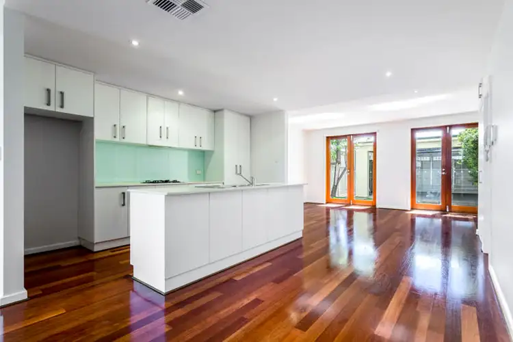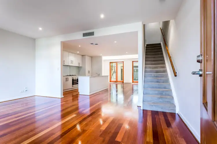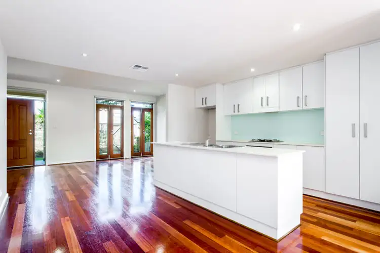 Enter into the modern open plan design, where stunning timber flooring is underfoot. The striking kitchen includes a generous island bench and cool-hued glass splashback. Keep clutter away and opt for the clever storage solutions down here.
