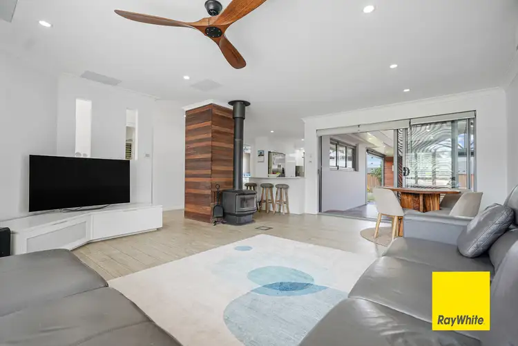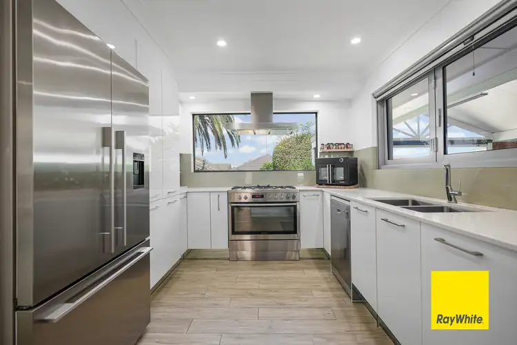The modern kitchen is renovated and boasts premium stainless steel appliances, including a rangehood, oven, dishwasher, and gas cooktop, making it both functional and stylish. With sleek tiled splash backs and a convenient eat-in breakfast bar, this kitchen is designed for both ease and elegance. It opens seamlessly into the dining area, creating an inviting space for guests to interact and enjoy meals together, making it ideal for both everyday living and entertaining.