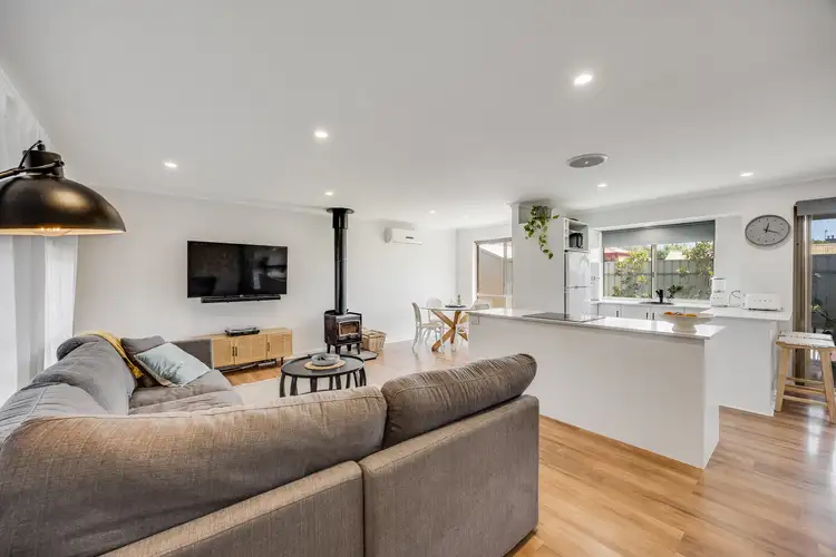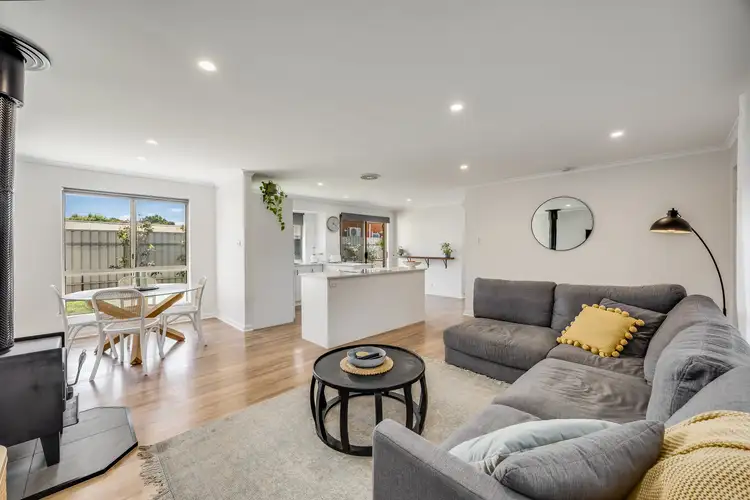 Stretching from feature brick frontage with veranda to north-facing rear, the surprisingly spacious floorplan is defined by an extensive living area. Wrapped with picture windows, canopied by high ceilings, lined with timber-look floors, and centered by combustion fireplace for all-seasons comfort, it's a home hub optimised for light and natural flow.