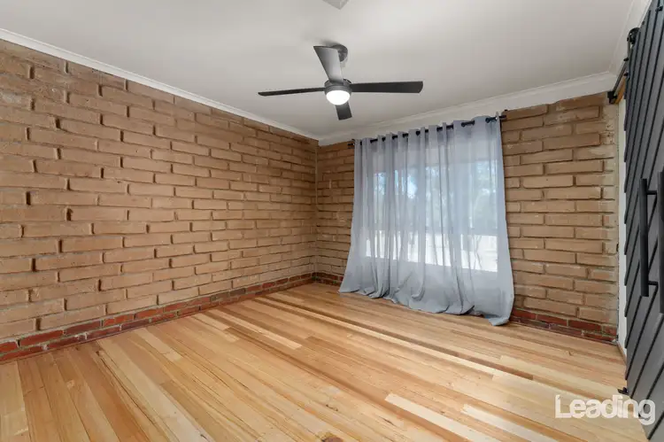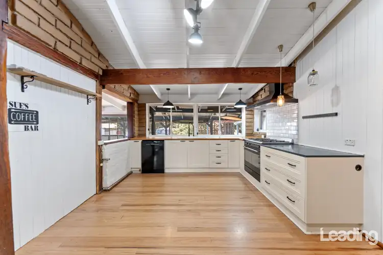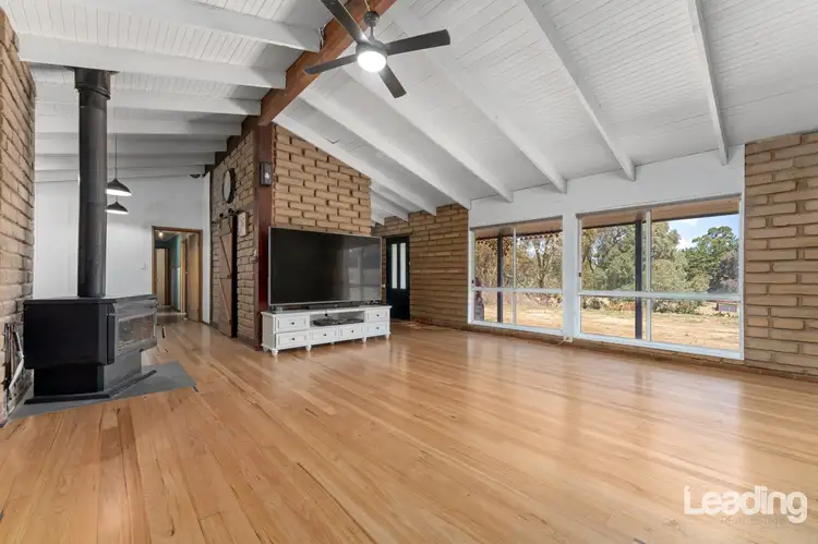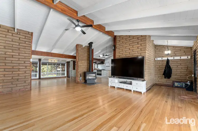 Stepping inside, you're immediately welcomed by soaring raked ceilings and exposed beams that create an inviting, open feel. The use of exposed brick throughout not only enhances the home's rustic appeal but also serves a practical purpose-keeping the interior cooler during the warmer months and retaining warmth in winter. The spacious main living area is designed for comfort, featuring a cozy Coonara fireplace, ceiling fan, and split system heating and cooling, ensuring year-round enjoyment.