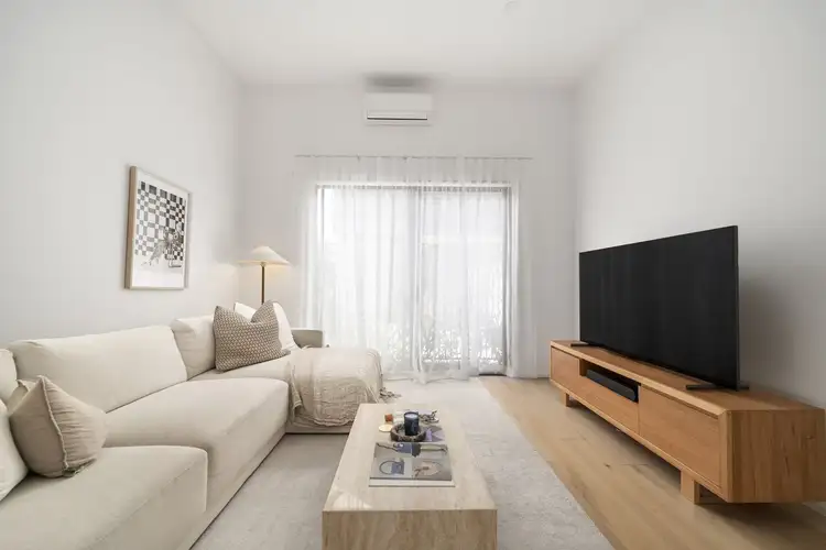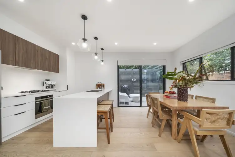 A spacious rear lounge is filled with northern sun, while a soaring 3.5m ceiling amplifies the sense of space. Sliding glass doors connect seamlessly to a lush star jasmine green wall, adding privacy and a beautiful scent-filled backdrop. The kitchen and dining area greet you on entry, with sleek stone benchtops, two-tone cabinetry, and quality appliances. A second set of sliding doors opens to a private courtyard for effortless indoor-outdoor flow. Upstairs, louvre windows invite refreshing cross breezes where three robed bedrooms are served by two stylish bathrooms. One bedroom enjoys its own north-facing balcony, ideal for soaking up the sunshine. A single garage with internal access, a handy third w/c, and extra storage complete the picture.