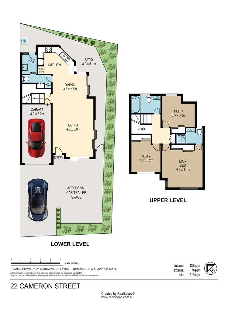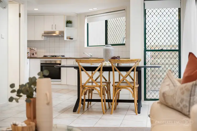 On the lower level, tiled open plan living and dining areas are filled with natural light and air-conditioned for year-round comfort. The kitchen offers abundant cupboard space and gas cooking, while sliding doors open to a private patio and landscaped courtyard retreat. A powder room, separate laundry, and secure garage with internal access add everyday practicality.