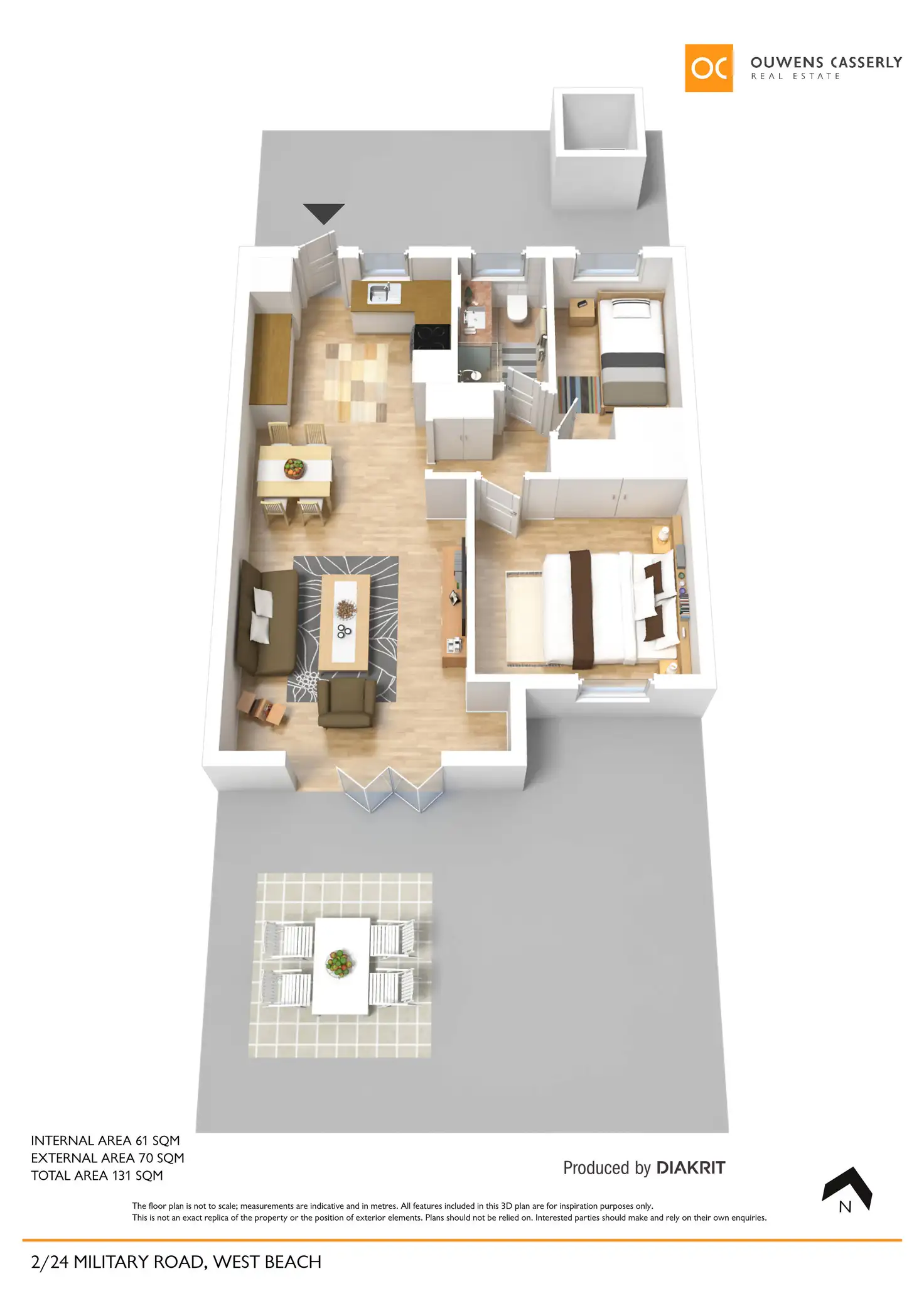 Open plan kitchen/living/dine opens to both front and rear courtyards, both with retractable hose