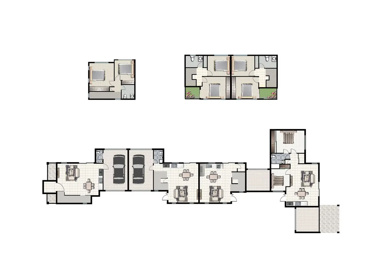 · Two-bedroom, one-bathroom double-storey townhouses, each with a single car garage