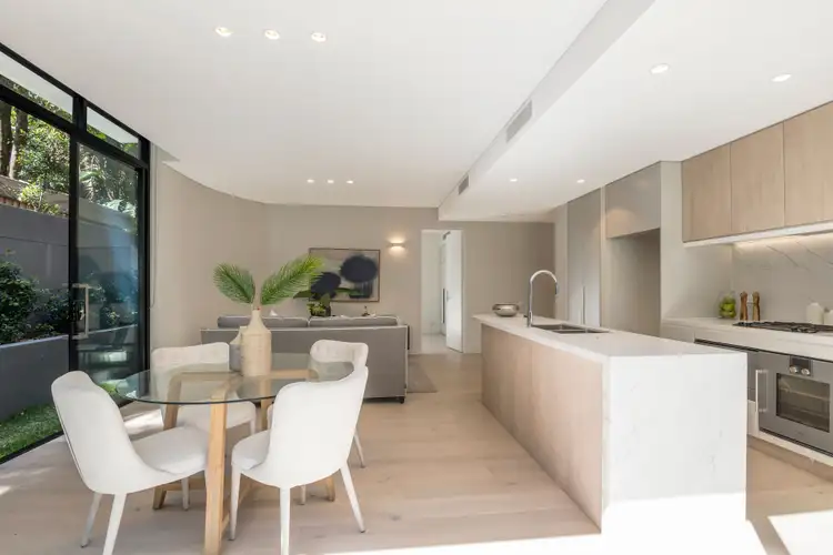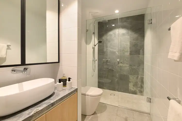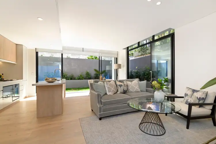 - A communal rooftop entertaining area offers views of the Sydney skyline, with a summer kitchen and tranquil courtyard garden