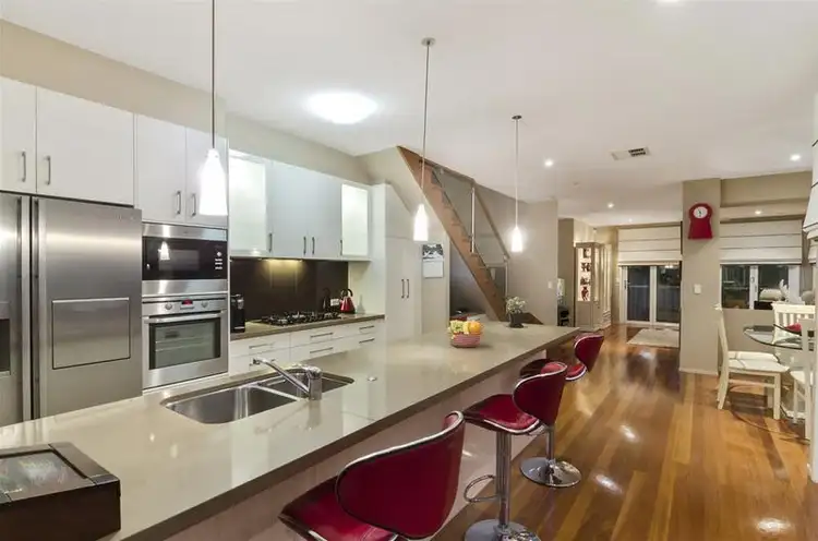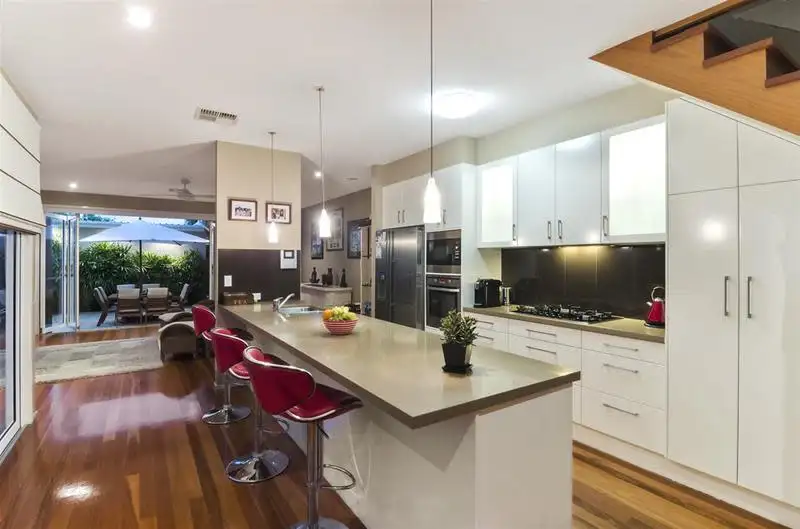 Dual open plan living areas with blackbutt polished timber floors separated by an impressive galley kitchen Caesar stone bench tops with Miele appliances and garbage disposal unit .