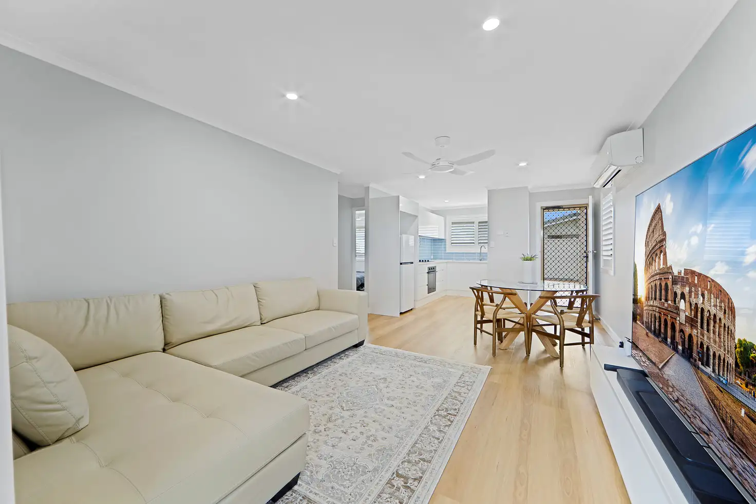 - Open plan living and dining with large split-system air-conditioning, ceiling fan and floor to ceiling blackout curtain.