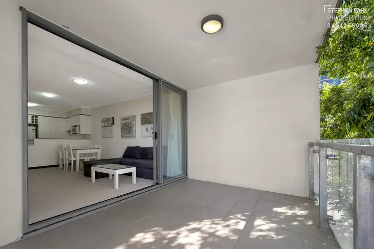 Being sold partially furnished, the first-floor apartment boasts a spacious layout with floor-to-ceiling glass doors connecting both the open-plan living area and bedroom to a large entertaining balcony.