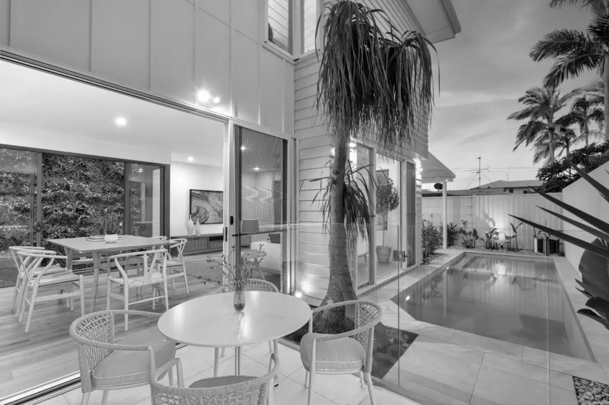 This stylish residence at 2/73 Lapoinya Crescent, Warana, offers a seamless blend of contemporary elegance and relaxed beachside living. With a gated and secure entryway leading into a grand 6.8-metre void, the entry feels spacious and airy, flooding the home with natural light and setting a welcoming tone.