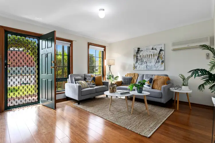 When we passed through the tidy landscaped garden and verandah into the fresh, light interior, with its warm timber floors, features and trims, we felt instantly at home. Large windows and sliding glass doors bring the outside in, and, in a highly functional layout, the generous living area flows through to a spacious dining room and kitchen. Reverse cycle air conditioning will keep you comfortable here all year round. The kitchen features ample bench and cupboard space, and a view over the back yard. Off the kitchen there's a good sized laundry with built in cupboards which leads to a separate toilet.