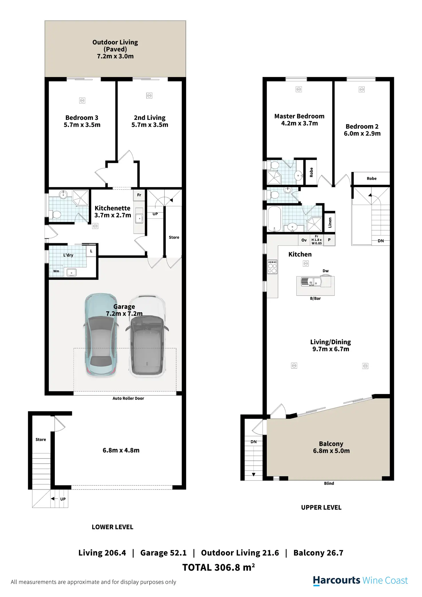 • Downstairs is a large double garage with a roller door, enough room for 2 vehicles and a boat