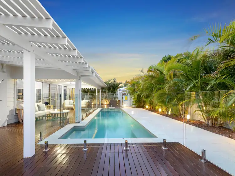 The open plan heart of the home takes centre stage. The kitchen, dining and living areas transition with ease to lush tropical gardens and a generous swimming pool positioned in the enviable north aspect.