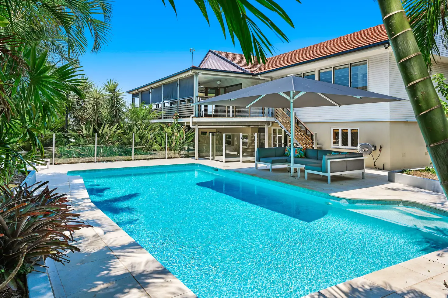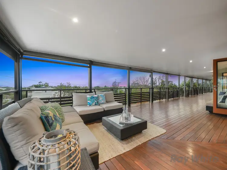 Upstairs a huge extra wide wrap-around verandah offers the prime vantage point to take in the elevated outlook, views stretching along the horizon taking in the shimmering blue Moreton Bay. With cafe style screening and an abundance of space, it is an enviable zone in which to relax and entertain. Those seeking garden surroundings will love the huge paved courtyard below, a sparkling resort-styled in-ground pool sitting centre stage within a landscaped perimeter - just in time for summer!