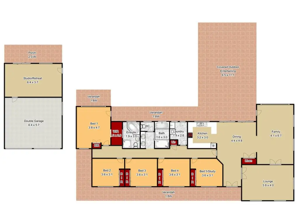 All of the bedrooms are a generous size with built-ins throughout and main bedroom with walk-in robe, additional built-in, spacious ensuite and separate access door. In addition, the separate studio/retreat features split system air conditioner, keypad entry, cat 5 data network, tasteful corrugated ceiling with track lighting and a large back verandah and is the perfect spot for a home-office, teenager retreat, guest accommodation, or sports bar/games room.