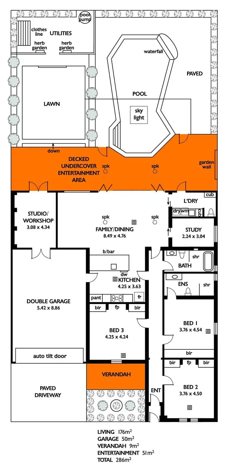 There is a gym/workshop or studio, which can be accessed from the secure carport or entertaining deck.
