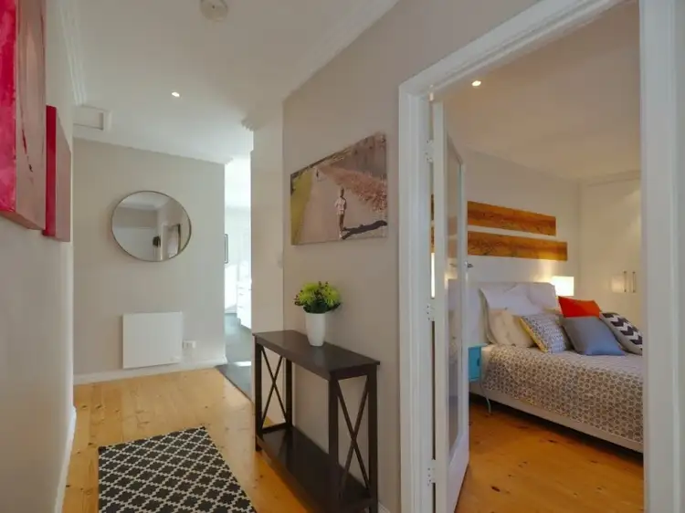 Sitting back from the kerb, framed by verdant foliage, the property projects a zesty and intriguing street appeal. Box hedging and a stretch of lawn frames the facade, a contemporary red door greets