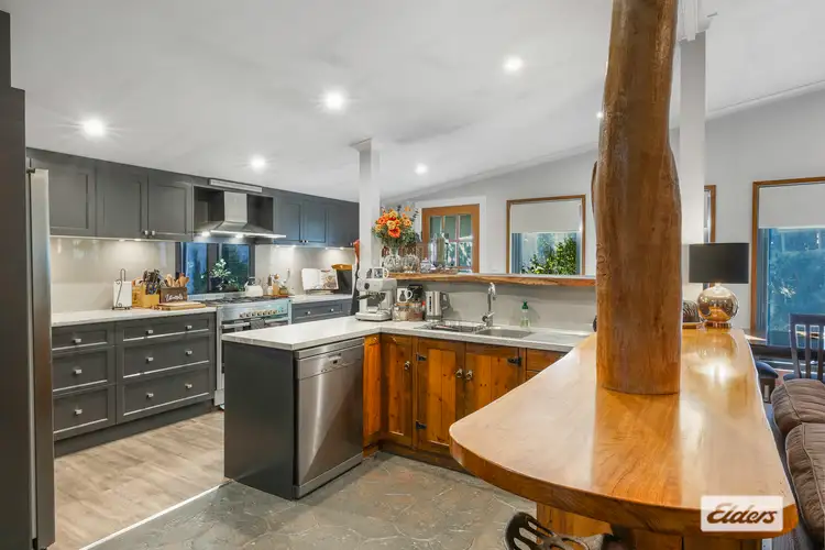 The heart of the home is the central living zone, where a pitched ceiling adds a sense of space and charm. This cozy hub includes a family room, dining area, and a well appointed kitchen featuring a freestanding cooker with gas cooktop, electric oven, glass splashback and dishwasher. Storage is plentiful, and the beautiful timber benchtop-milled right from the property adds a rustic touch. You'll also spot two striking feature gum beams, cleverly incorporated into the design as a nod to the home's roots.