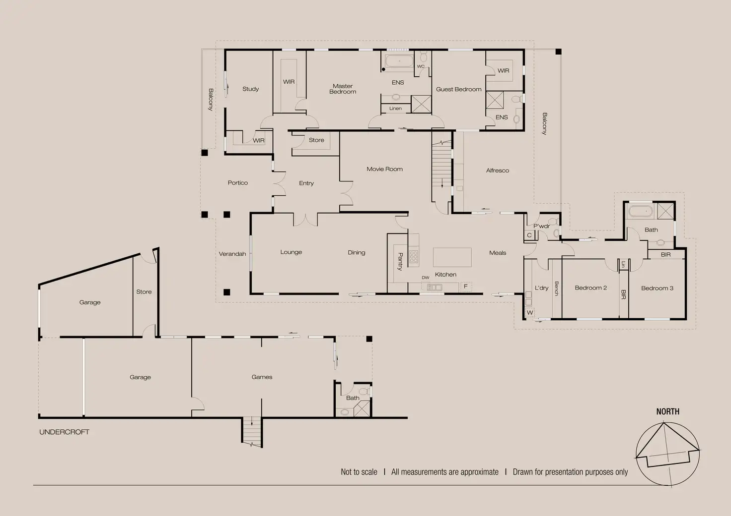 Under-croft is cavernous storage and garaging for up to 3 cars and a games room with kitchenette, bar and its own en-suite, which would work perfectly as a granny flat, teenagers residence or au-pairs quarters.