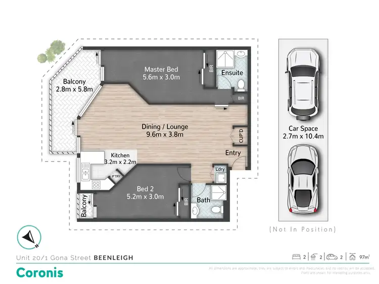 The open-plan design seamlessly connects the kitchen, dining, and living areas, creating a welcoming and functional space. The main living area is equipped with split-system air conditioning, ensuring comfort year-round. Both bedrooms are generously sized, with the master bedroom featuring its own private ensuite and has a balcony that extends to the entrance of the living area, while the guest bedroom is conveniently positioned adjacent to the main bathroom along with private balcony.