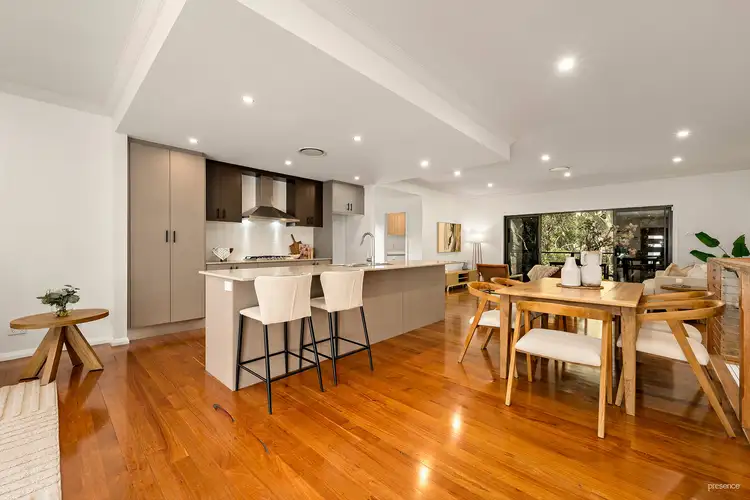 Inside, the home flows over two levels, giving everyone space to do their thing. Step through double doors into a generous open plan living zone where your eye is pulled straight to the greenery out back. Slide open the doors and you're on the covered deck. It's the perfect spot for slow breakfasts, relaxed afternoons, and balmy dinners while bellbirds chatter around you. The island kitchen is the social hub, complete with a large walk-in pantry, and there's a study nook nearby for homework or work-from-home days. The main bedroom sits privately with its own ensuite and walk-in robe, and the fourth bedroom doubles nicely as a home office if that's on your wish list.