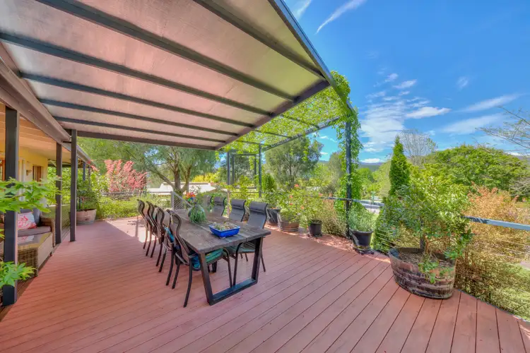 Outside, a sprawling verandah and covered patio beckon for outdoor dining and leisure, framed by a trellis with cascading vines. Delight in breathtaking views over treetops to alpine mountain ranges, including the snow-capped Mt Bogong in winter. The mature gardens and tranquil firepit create a picturesque setting for starlit nights. With additional features like a shedding, carport, and workshop, and just moments from Bright township, this is more than a home-it's a peaceful retreat where nature and elegance converge.