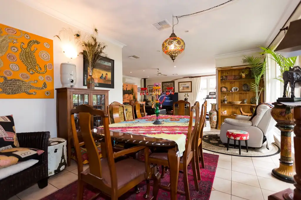 Through the front door, enter into the spacious living and dining area that boasts large casement windows, split system air con and lovely wooden French doors leading to the back entertaining area. There?s also a combustion wood heater that warms the room on those chilly nights.