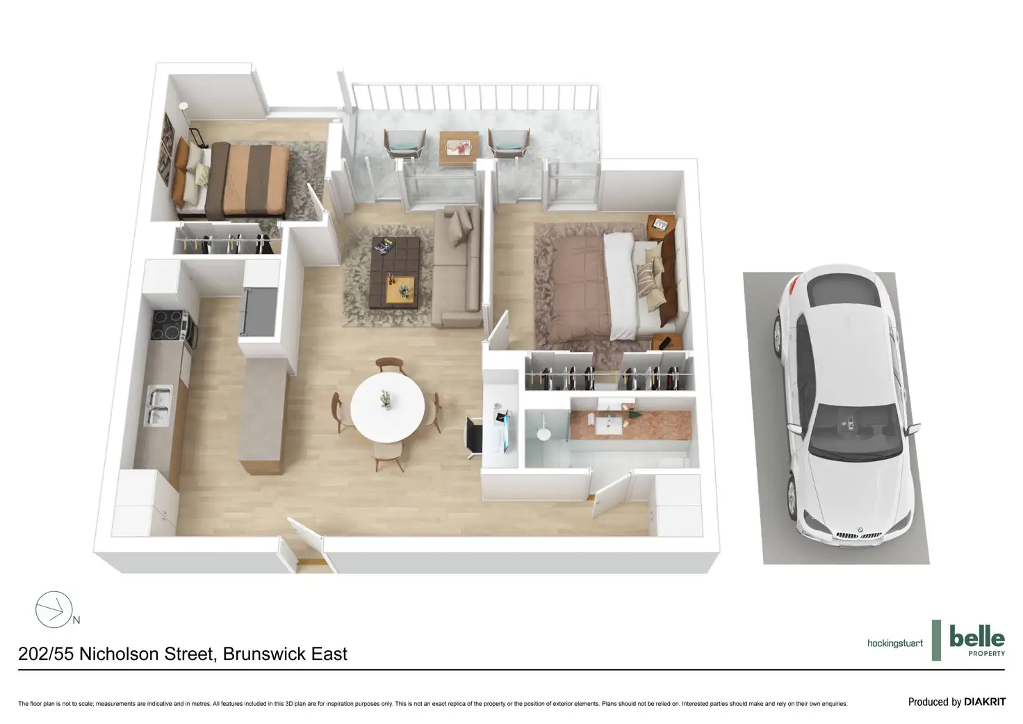 NGBE apartments feature double glazed windows, hydronic panel heaters to living areas and bedrooms, recycled Australian hardwood timber flooring throughout including both, bedrooms with generous BIRs, induction cooktops, and high exposed concrete ceilings with feature pipes. This particular apartment features upgrades including designer linen sheer curtains, generous storage throughout, bathroom with walk in shower and wooden vanity draws and mirrored wall storage.