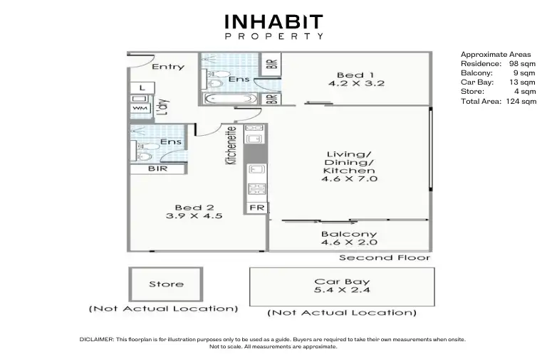 - Internal: 98sqm, Balconies: 9sqm, Cars: 13sqm, Store: 4sqm, Total: 124sqm
