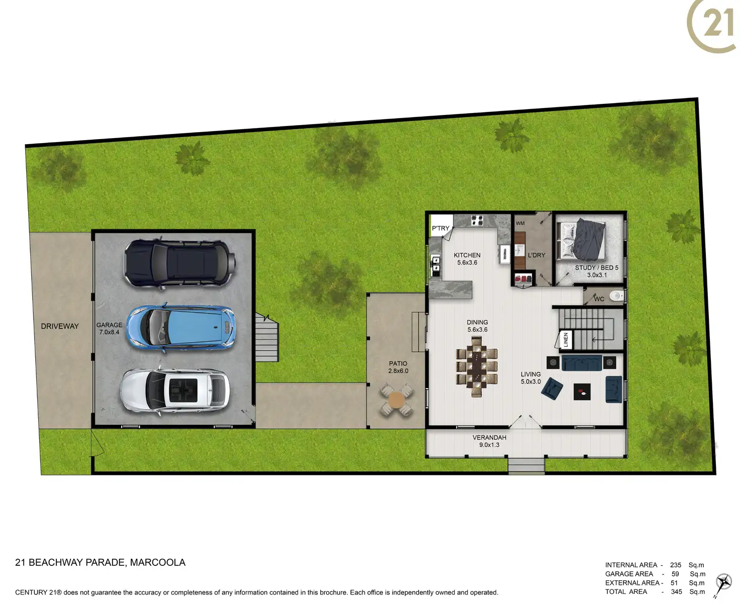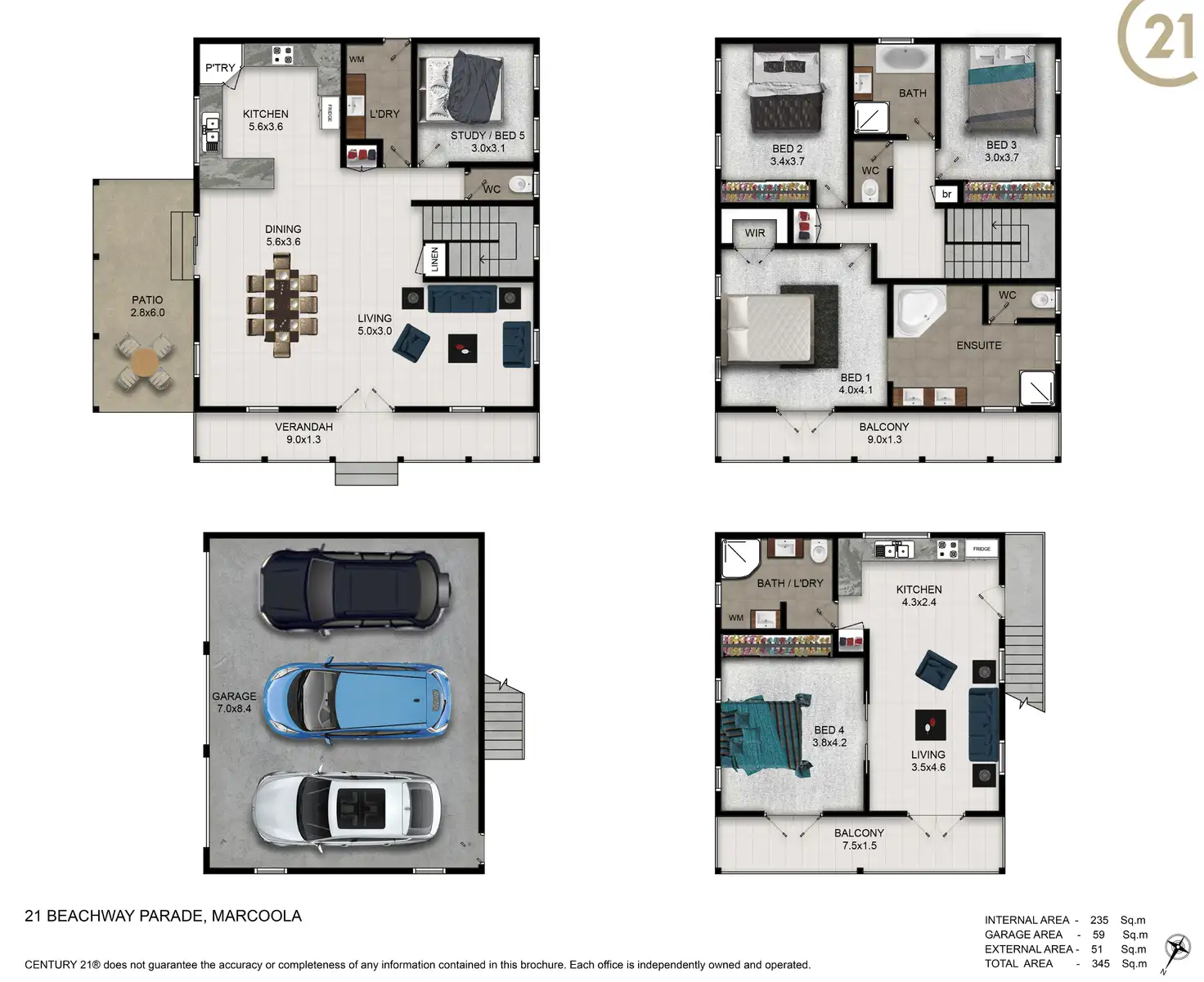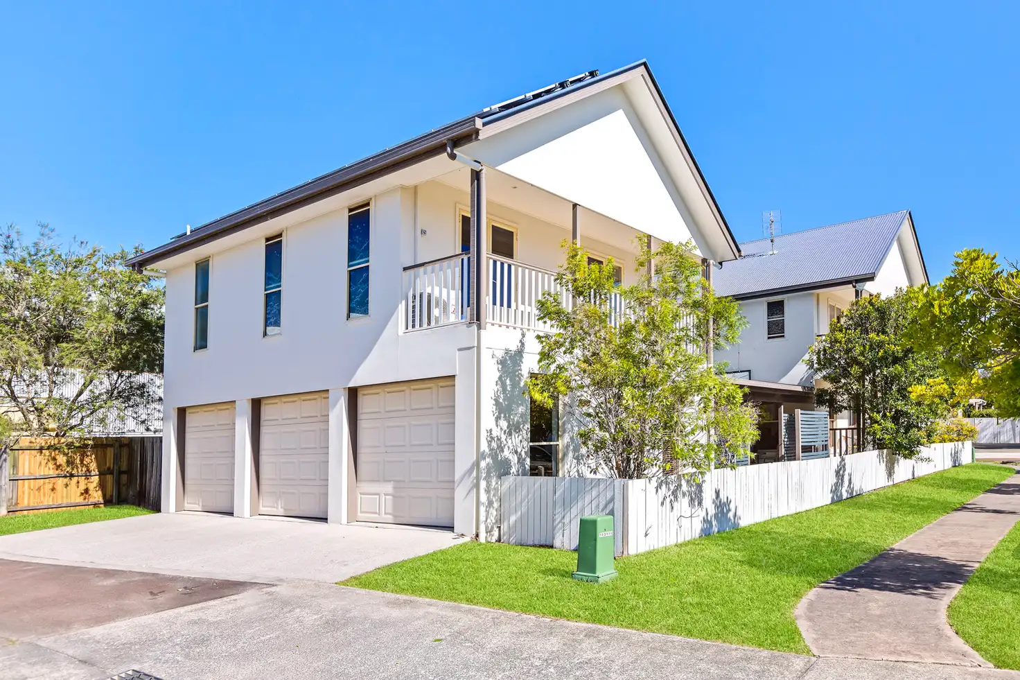Across two light-filled levels, the main home comprises four bedrooms, two bathrooms, open plan living, study nook, large kitchen, upper and lower north facing verandas, rear alfresco terrace, and separate laundry. The granny flat is above the triple lock up garage, and comprises air-conditioned main bedroom, kitchen, living room, bathroom, laundry, and north facing balcony.