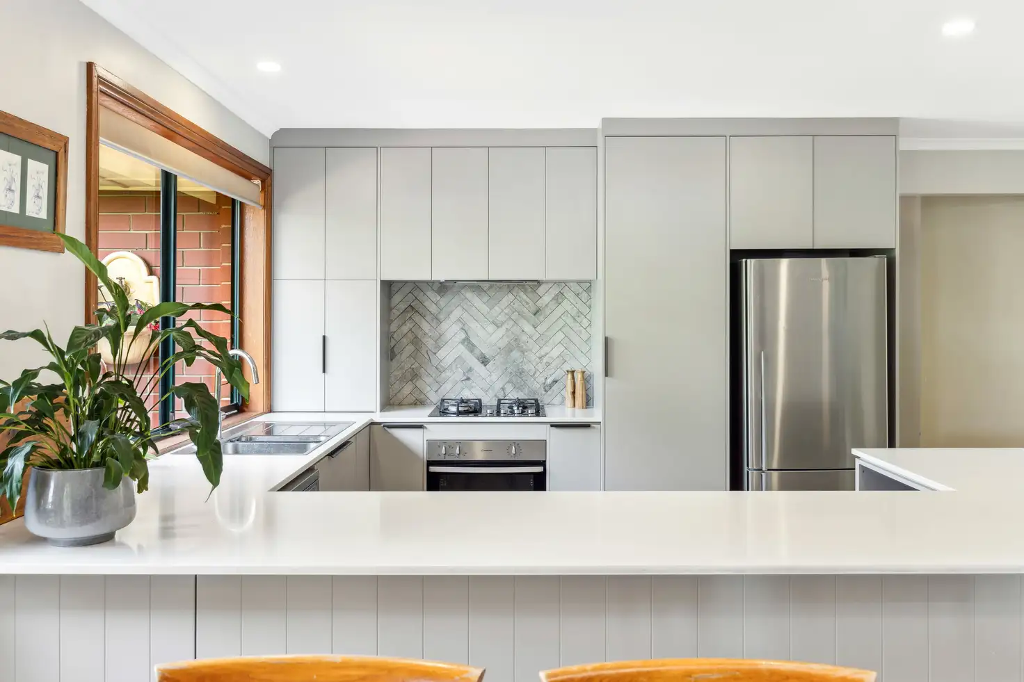 At its helm, the host's rebooted prize is a chic kitchen remodel with soft-closing joinery, stainless appliances, herringbone feature tiles, and a swathe of stone benchtops with the ability to dish and mingle with the dinner group.