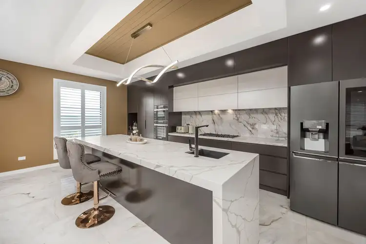 The chef's kitchen features 40mm stone benchtops, a 60mm waterfall island, hydraulic overhead cabinetry, and premium appliances, while the butler's kitchen provides extra prep space, dual pantries, and an additional gas cooktop—perfect for entertaining.