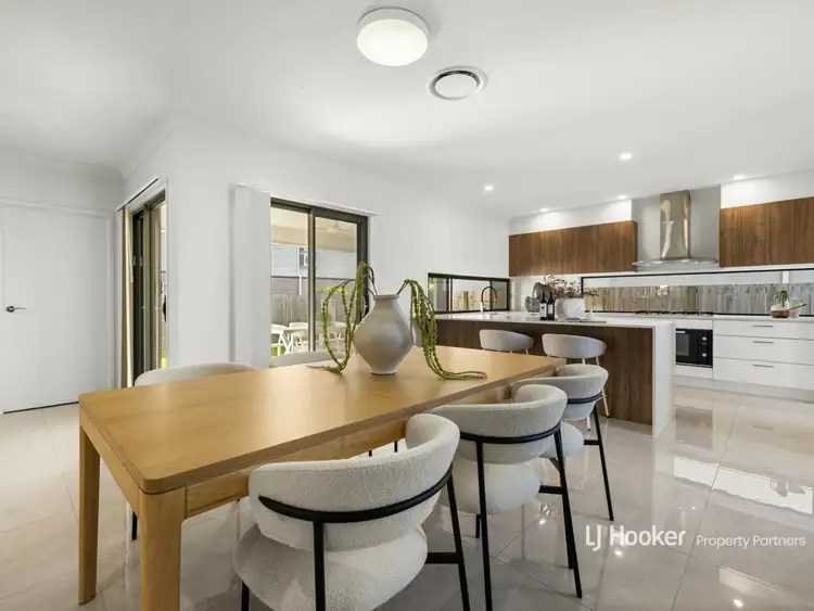 Premium large-format floor tiles span the lower floor, where a MasterChef kitchen provides a bird's eye view over the adjacent lounge and dining area and onto a fan-cooled alfresco patio. There's also side aspect with a picture window splashback.