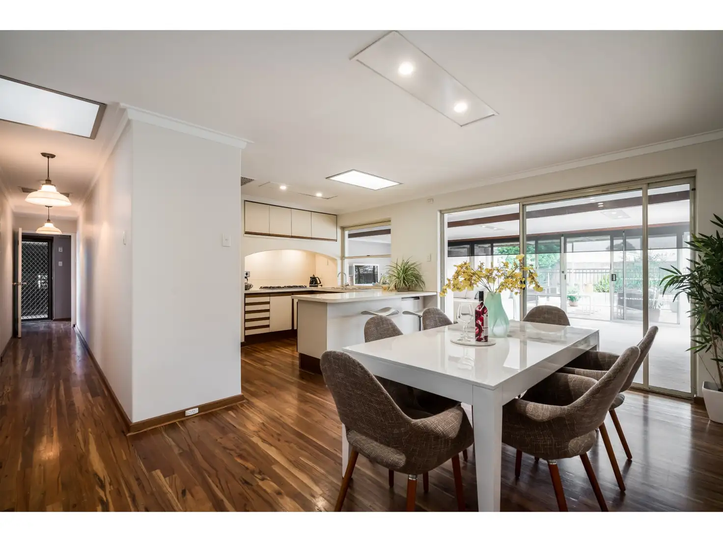 expect when first arriving at this property. Large opened family room with floor to ceiling windows all around.Views to the pool, outdoor entertaining area and gardens. New Westral solar blinds to block out the afternoon sun without compromising the view. Kitchen and meals area also boasts views to the pool with blackbutt polish floors, quality stainless steel cooking appliances, Electrolux wall oven (1 1/2 ovens ) separate gill, large Panasonic microwave five burner gas cooktop. Loads of storage space. Through to the laundry. This room is so large could easily be converted to a fourth bedroom. Or remain as it is using the space as office/study/ laundry. Again loads of storage and views to the pool. (this room does lend its self to a little modernising very 1970's) But a great space. Down the hall to the first of two toilets. Next the bathroom with separate shower space new nano coated shower screens. (no more soap and scale build up) bathtub, new mirror and great lighting. Two good sized bedrooms with built in robes, both robes have power supplied spaces for phones computers etc, block out and sheer curtains. Heading down the impressive hallway with it's polished blackbutt floors and Manor pedant lights to the spacious main bedroom. Mirrored built-in robes overhead cupboards, then some more cupboards, draws, hanging space for evening gowns and a vanity cupboard just for her. Block out and sheer curtains. Though to the ensuite, new shower screen ( nano coated) new mirror, and white timber look blinds. second toilet.