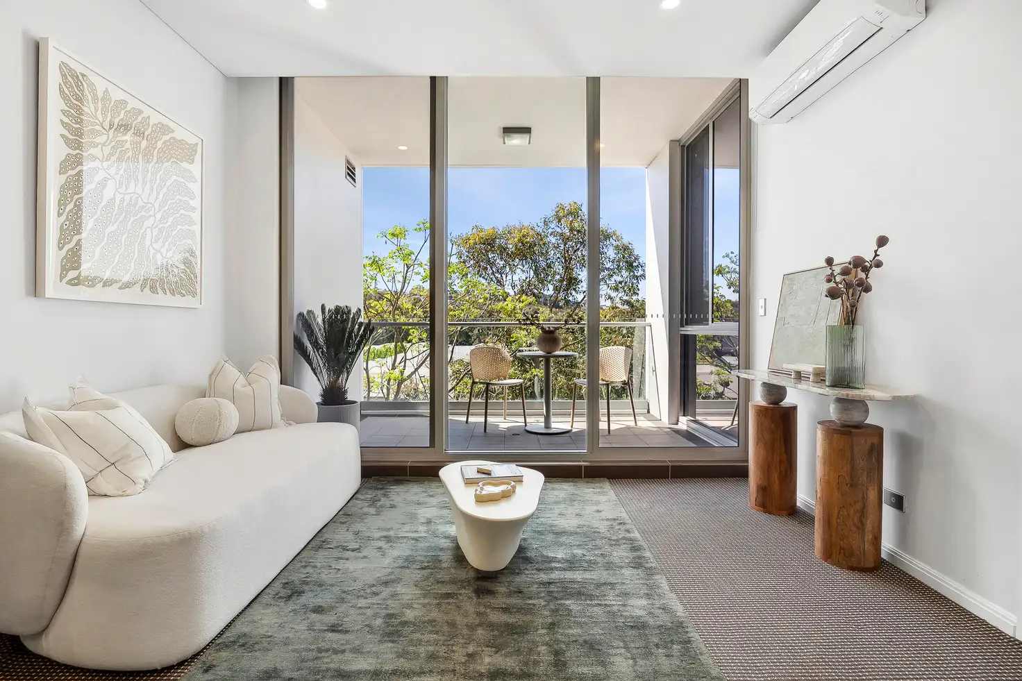 “Sunlit modern apartment in resort-style complex.”