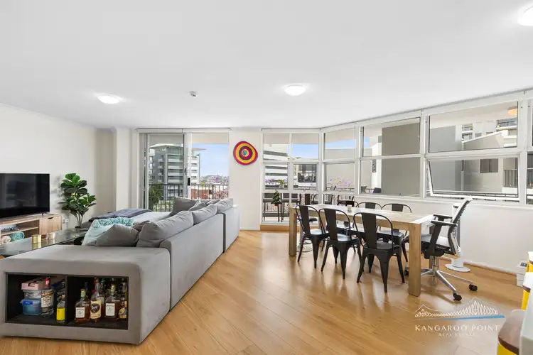 The spacious living room is complete with oak hardwood floors that run throughout all living areas, exuding a touch of elegance and warmth. At the heart of the residence a sensationally large kitchen is equipped with a breakfast bar, quality stainless steel appliances and ample cupboard space. A good-sized covered entertainers balcony awaits, offering the perfect spot for relaxing and hosting guests - looking out across Kangaroo Point to the Brisbane River and New Farm.