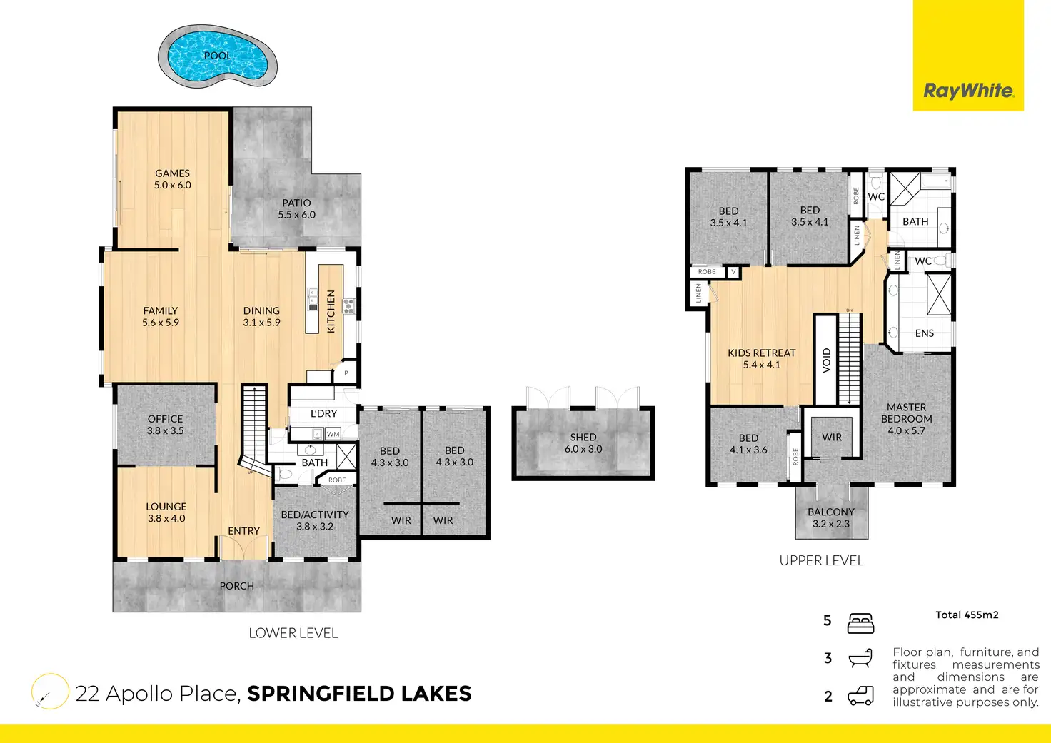 • Five spacious bedrooms + three bathrooms across two levels