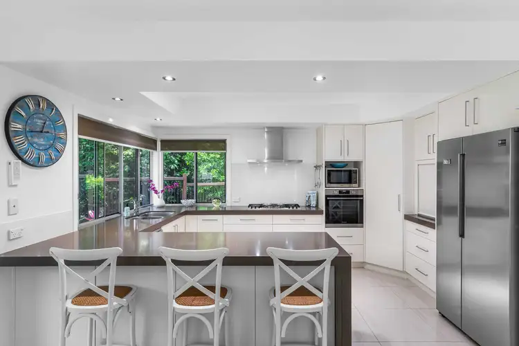 A favourite room is the oversized third living space/lounge room with floor length windows overlooking the pool. The room can be closed off for further privacy and ensures all members of the family have space to spread out. The pristine landscaped garden features low maintenance tropical plantings and the great sized yard and stunning bush backdrop sets a private and inviting space. The pool is quite a feature of the property and is viewed from many rooms in the home. Facing north, it benefits from year- round sun and its resort style wrap around design sets the tone for the home's holiday feel!